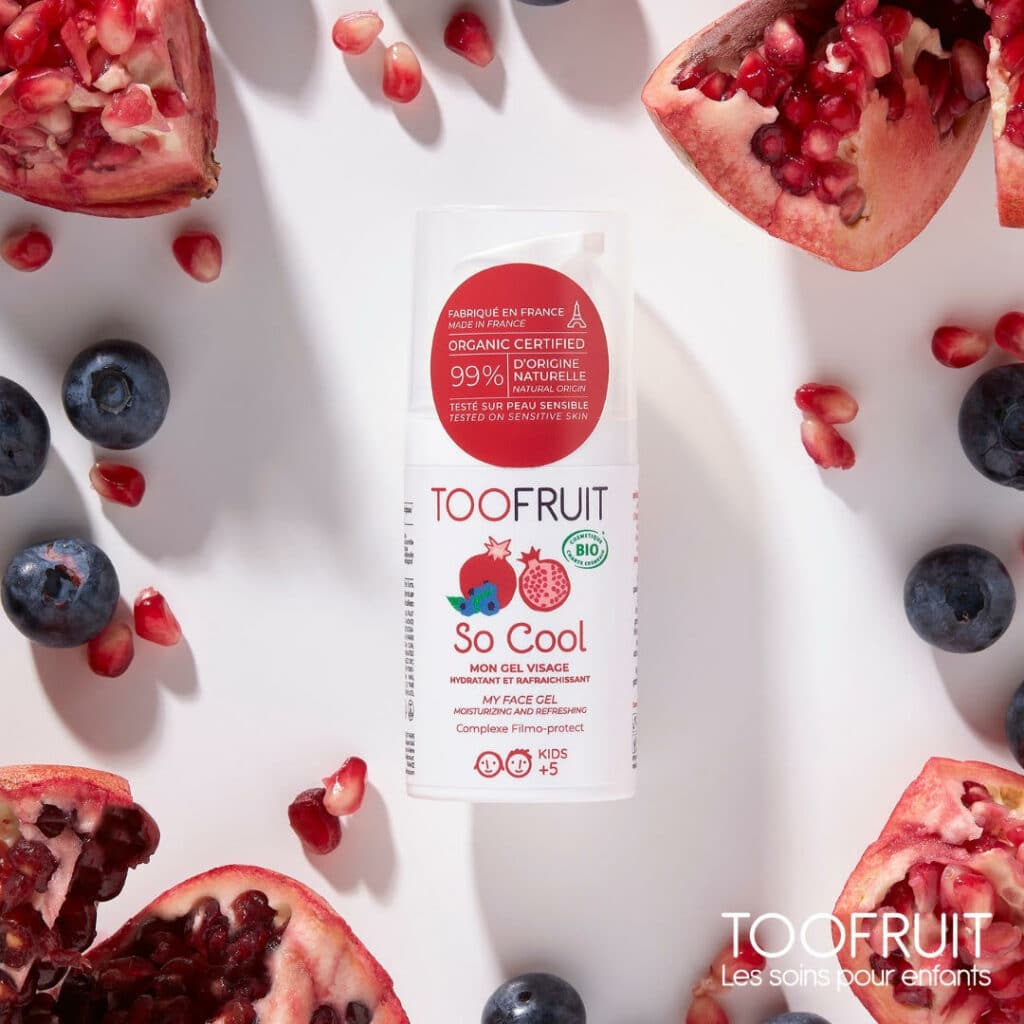 Soin hydratant, rafraîchissant et apaisant, notre gel hydratant So Cool certifié bio trouvera naturellement sa place dans la routine visage de votre enfant. Adapté à la peau des plus jeunes dès 5 ans, notre gel au parfum gourmand de grenade et de myrtille est idéal pour les préadolescents avec un début de zone T (front, nez, menton) et une peau à tendance grasse.